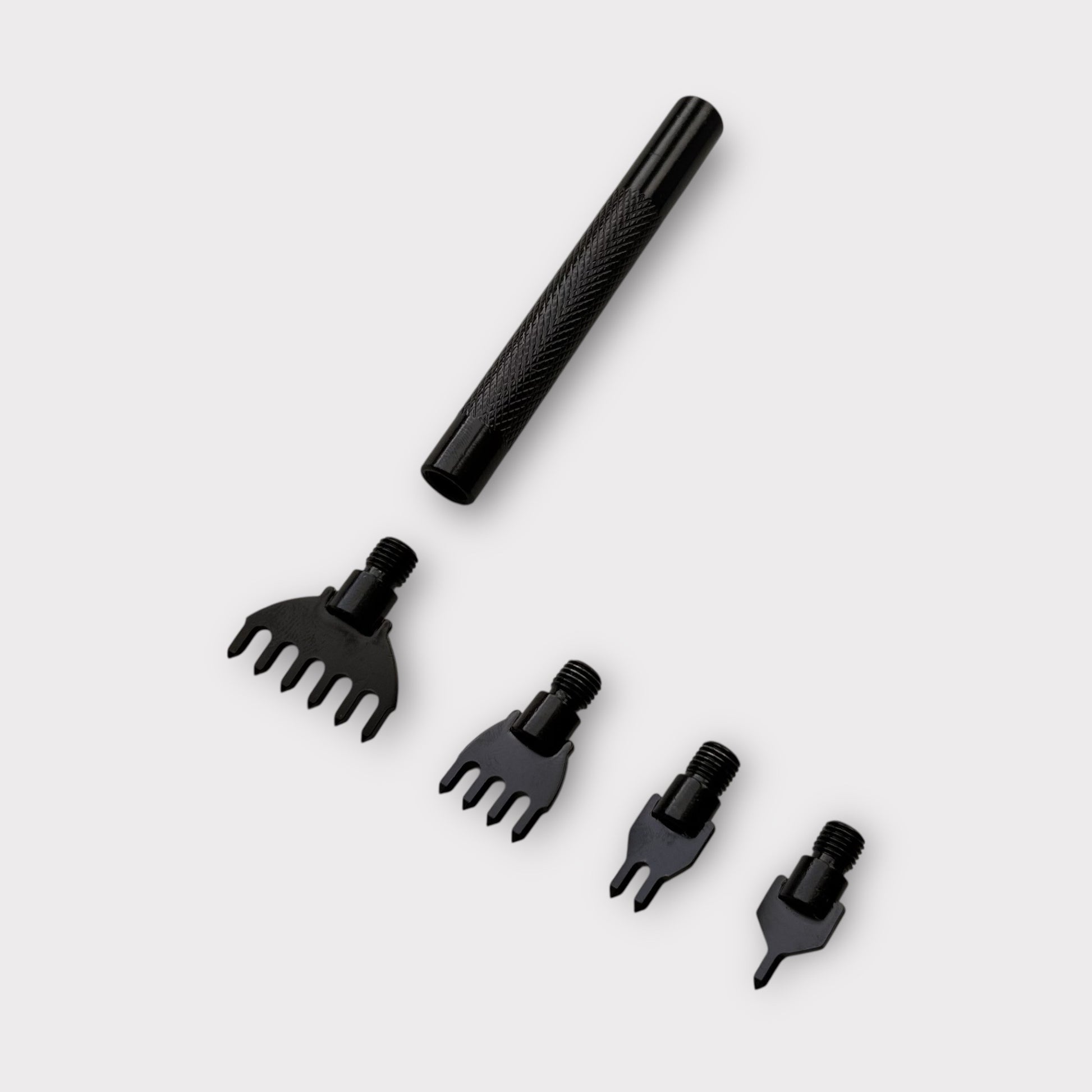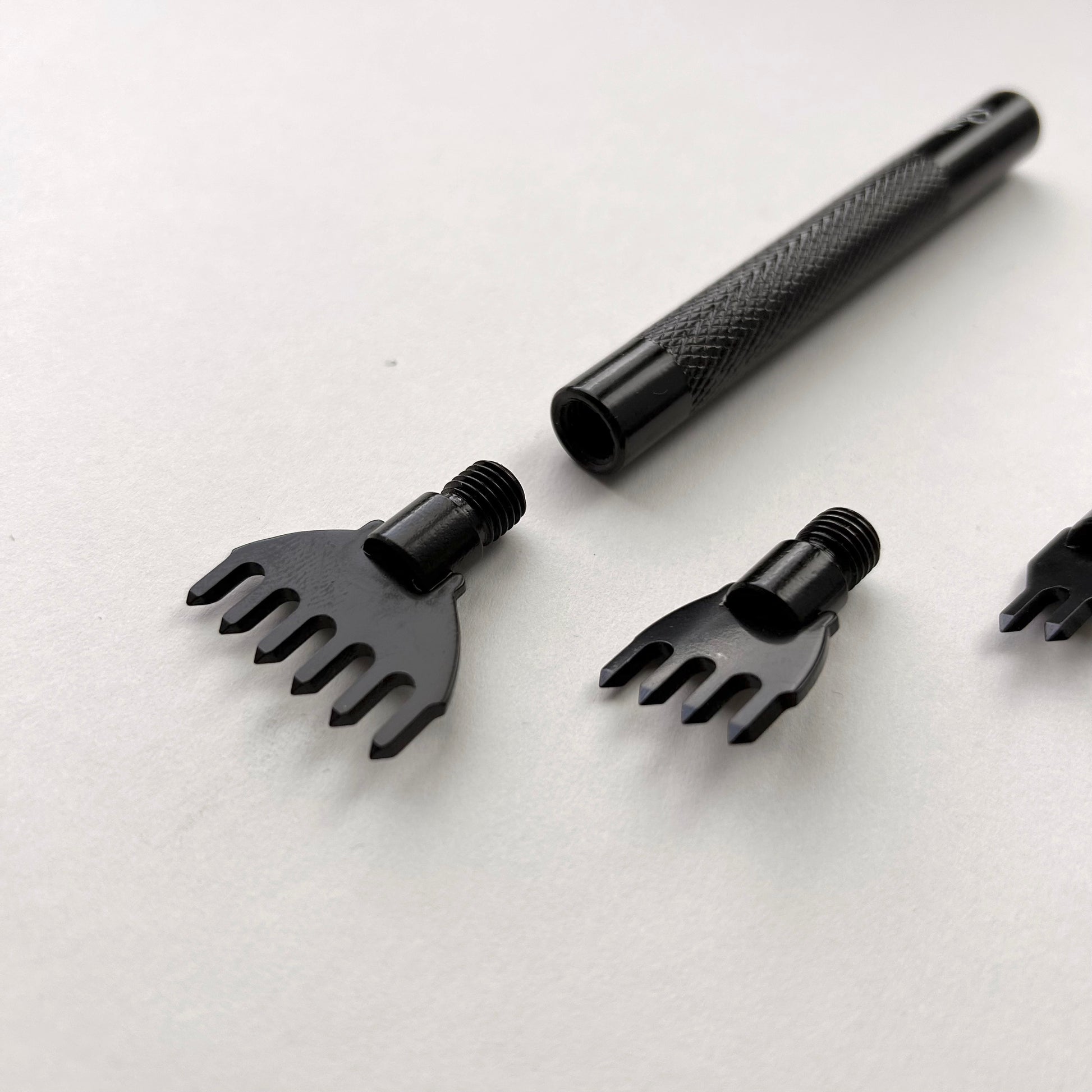 The Diamond Leather Stitching Punch 5 Piece Set is designed with removable diamond-point tips. This stitching punch set makes it easy to punch precise holes and prepare your leather projects for stitching. The set includes 1, 2, 4, and 6-prong removable chisels, allowing you to change the heads to best suit your project needs. The punch prongs give a 3mm (1/8") stitch hole with 3 mm spacing.