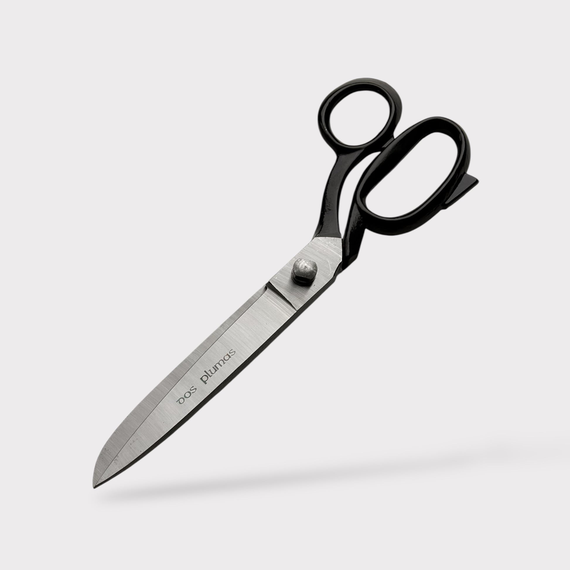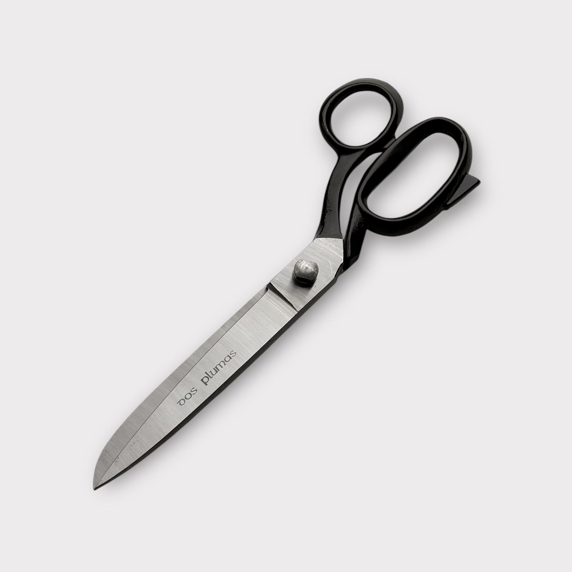 Dos Plumas Tailors Shears with side-bent handle and polished blades. These are professional trade tailors shears, tough and durable with a sharp cutting edge. They are made in Italy from the finest drop forged steel, with polished blades and a black handles.