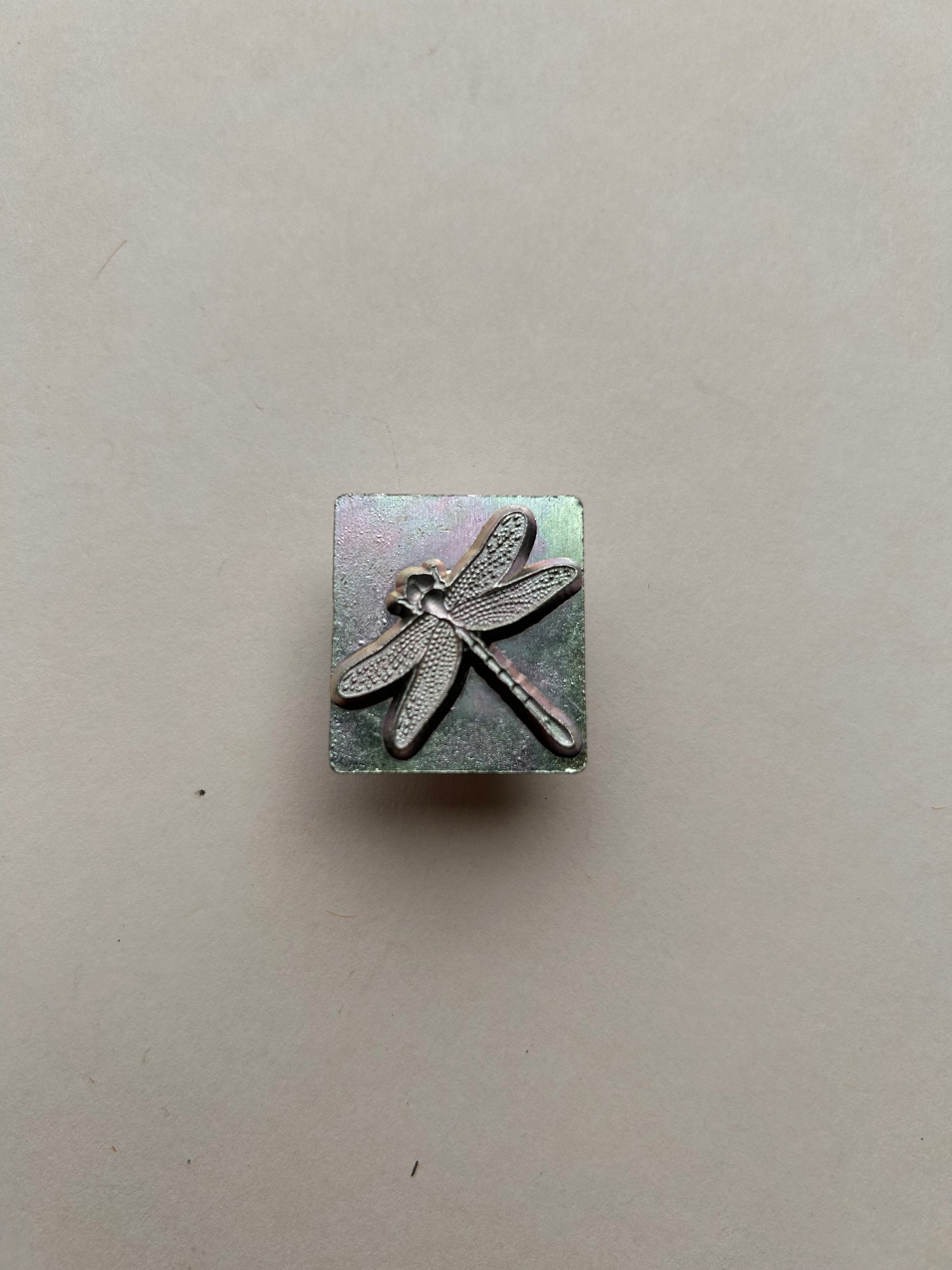 Leather embossing stamp with a detailed decorative dragonfly, for leatherwork and carving projects. For use with an embossing stamp handle (such as the spring loaded stamp handle, heavy duty ram foot or hefty handle) and