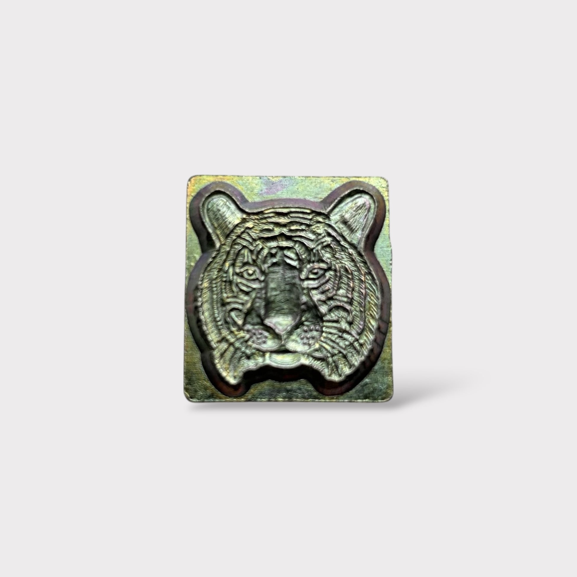 Leather embossing stamp with a detailed decorative tiger head for leatherwork and carving projects. For use with an embossing stamp handle (such as the spring loaded stamp handle, heavy duty ram foot or hefty handle) and