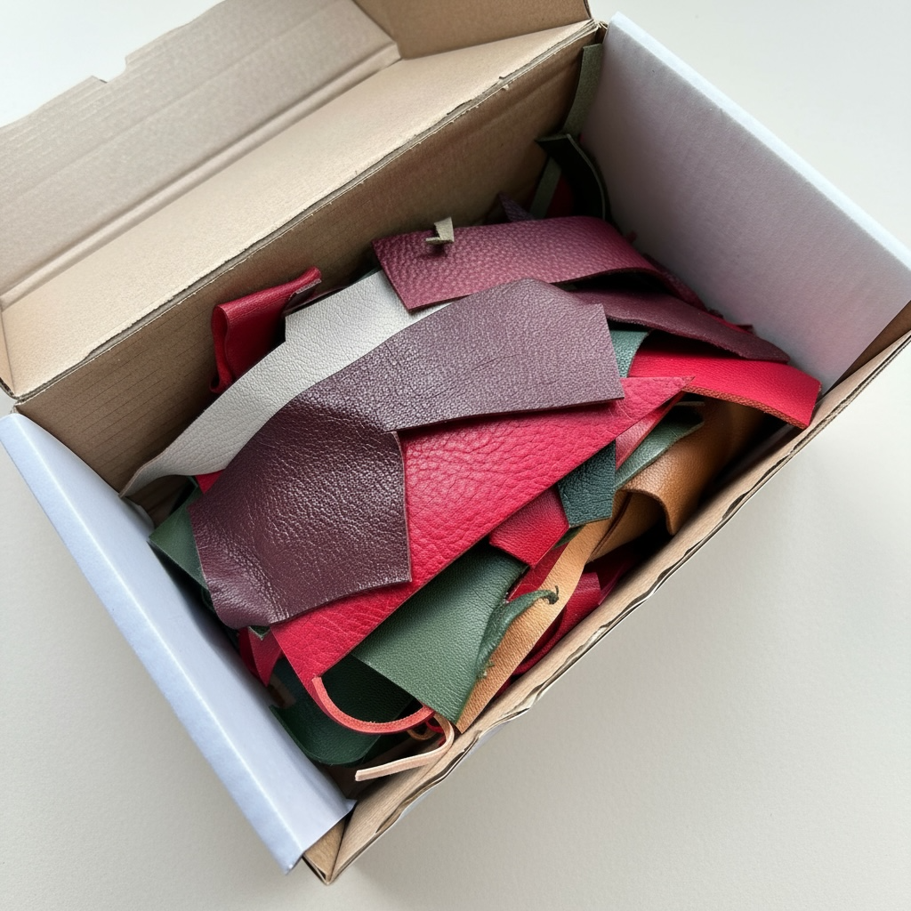 A box of full grain vegetable tanned leather off cuts in various shapes and mixed colours. Off cuts are available in all black, tans or mixed colours. This is high quality natural Italian vegetable tanned leather, with thicknesses between 1.5 to 2 mm*.